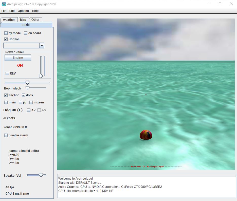 When navigating long distance (unless you are feeling more “adventurous”) you may want to use the “AutoPilot” and/or the “AutoSail” features; just point in the direction you want to go and press “Ctrl-P” to keep heading in that direction and “Ctrl-S” to let the program automatically adjust sails according to wind/boat direction/speed; remember you can still jump from one boat to another (select boat) and the program remembers your position in relation to the boat unless you are “flying”. If you are flying, get close to the boat and press “O” to get “on-board”.