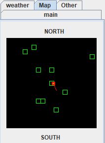The “Map” tab has an abbreviated MINI-MAP which show your position (red square) in relation to all (ten) randomly generated terrains (green) and gaze direction. It will also show position of other boats in your scene (orange)